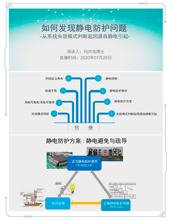 劉博士演講了關(guān)于我們應(yīng)該如何發(fā)現(xiàn)靜電防護(hù)相關(guān)的問題,而從這些系統(tǒng)失效模式來判斷起因是否源自靜電引起?整個(gè)分享內(nèi)容涵蓋了八大模塊內(nèi)容的講解:
